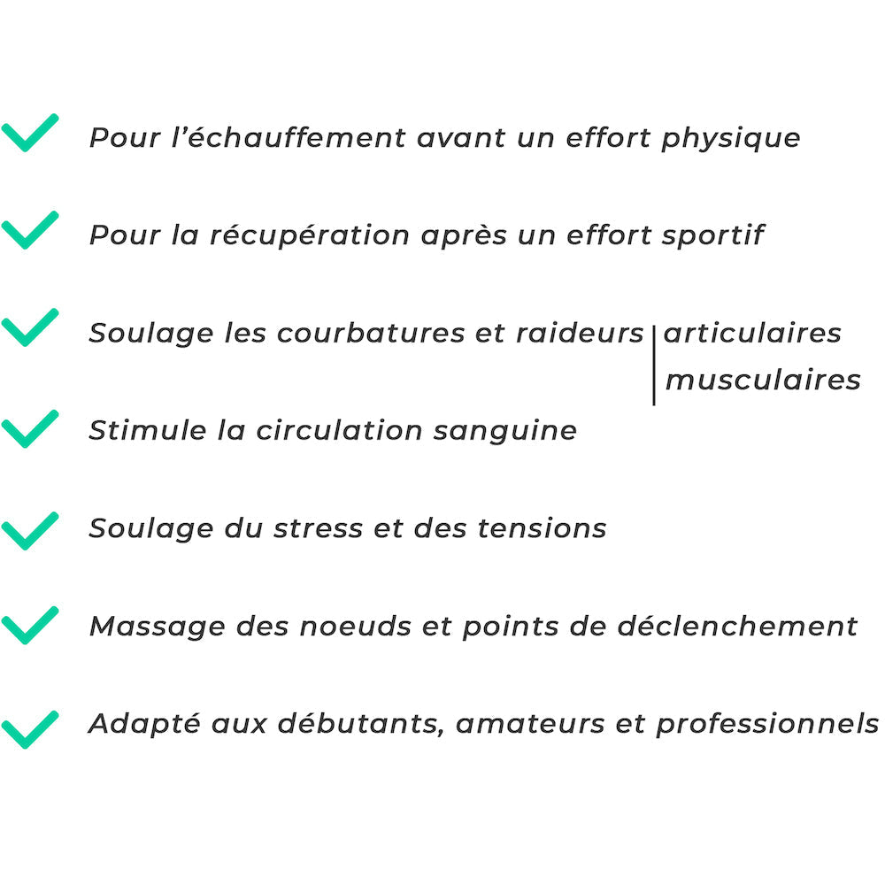 • À l'échauffement pour préparer vos muscles : maximisation de vos performances tout en préservant l'intégrité de vos muscles.