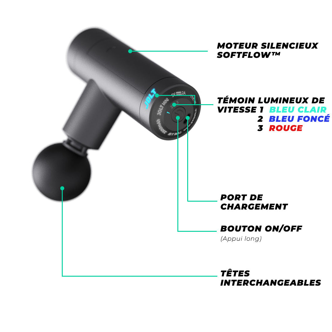 JOLT Mini est un pistolet de massage dernier-cri qui aide à relaxer vos muscles endoloris ou courbaturés et permet de rétablir votre mobilité. JOLT Mini a été conçu et développé par notre équipe, avec l’appui de professionnels du sport et de la médecine.
